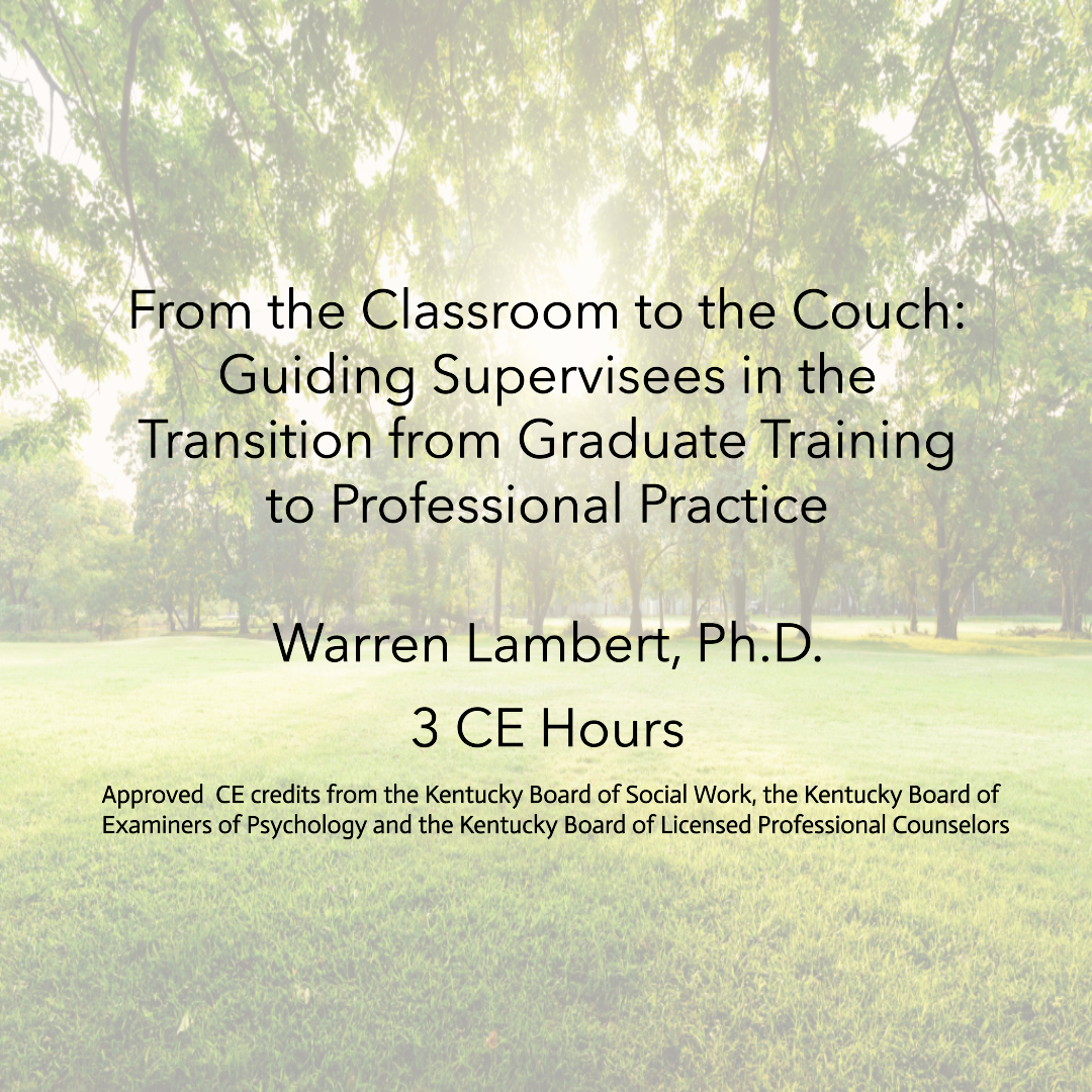 Join Dr. Warren Lambert for a comprehensive workshop guiding supervisors in helping their supervisees transition from graduate training to professional practice. Learn effective strategies, practical tools, insights to ensure a smooth and successful move from classroom learning to real-world applications.