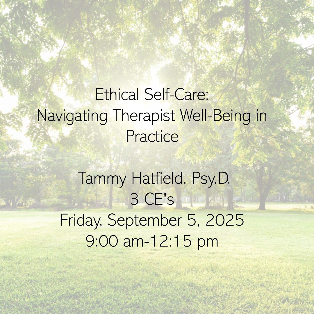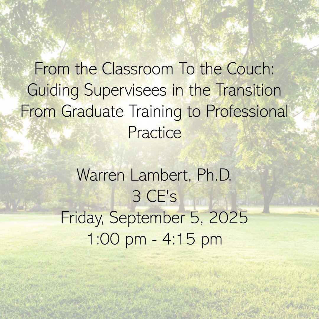 Free Retreat Event $0.00 Sold out Full day Supervision & Ethics CEs Sale Price: $360.00 Original Price: $400.00 Sale From the Classroom to the Couch Sale Price: $225.00 Original Price: $250.00 Sale Ethical Self-Care Sale Price: $225.00 Original Price: $250.00 Sale